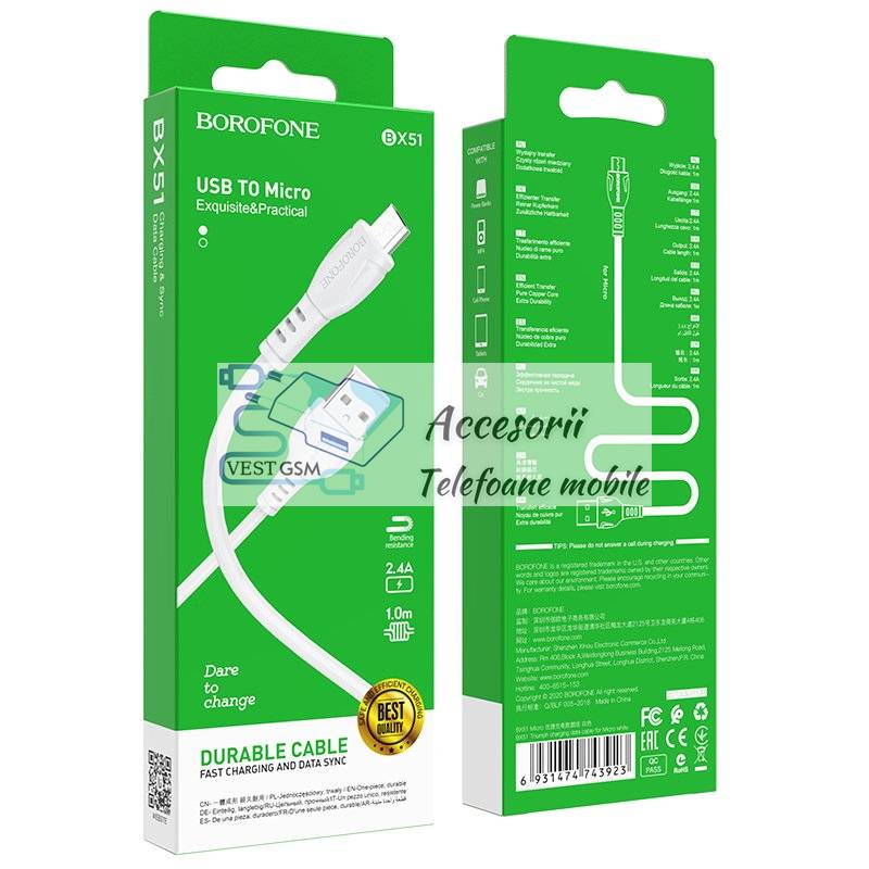 Comanda instant - Cablu de date Borofone BX51 USB to microusb 2,4A alb