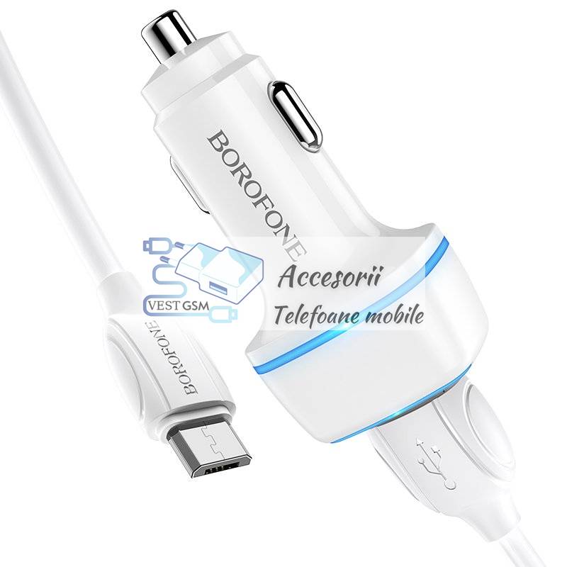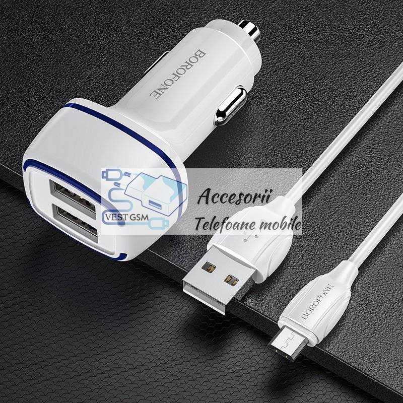 Incarcator auto Borofone BZ14 Max - 2xUSB - 2,4A + cablu microusb alb