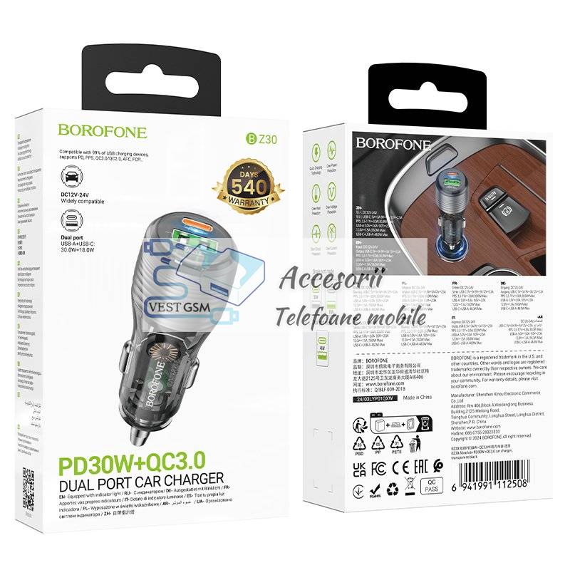 Incarcator auto Borofone BZ30 USB + Type C - QC 3.0 PD 30W 3A negru