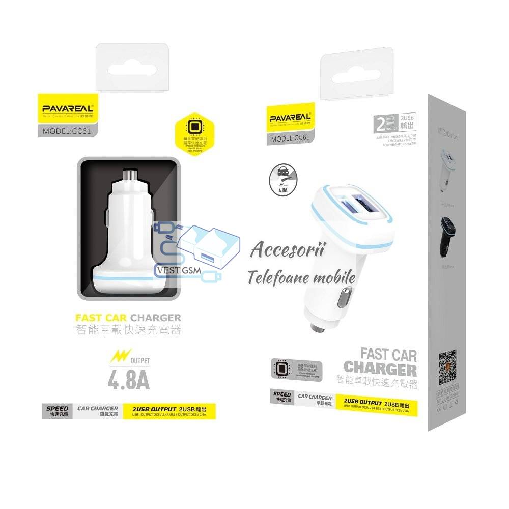 Incarcator auto PAVAREAL CC61 2xUSB A, 4,8A, alb